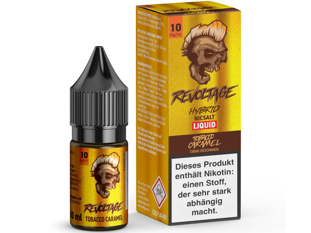 Revoltage Tobacco Caramel ist ein E-Liquid in der 10-ml-Flasche mit dem Geschmack von Tabak, Karamell und einem Nikotingehalt von 0mg, 10 mg oder 20 mg.