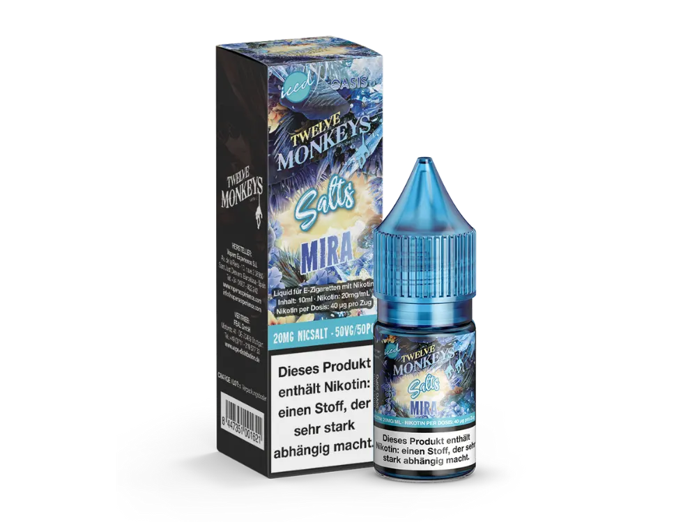 Twelve Monkeys Mira ist ein E-Liquid in der 10-ml-Flasche mit dem Geschmack von Blaubeere, Ananas, Kiwi, Eis und einem Nikotingehalt von 20 mg.