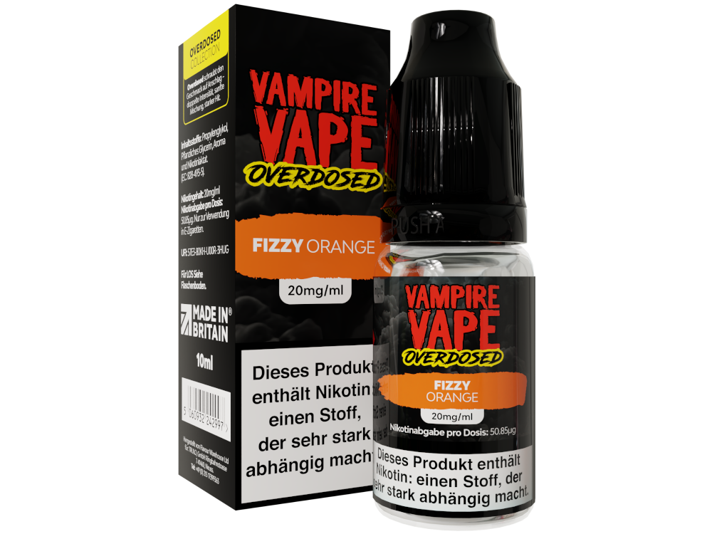 Vampire Vape Overdosed Fizzy Orange wurde in England hergestellt. Vampire Vape Overdosed Fizzy Orange ist kompatibel mit Pod Systeme von Uwell, Elfx, Voopoo und Vaporesso. Vampire Vape Overdosed Fizzy Orange können Sie in unserem Vape Shop günstig kaufen.
