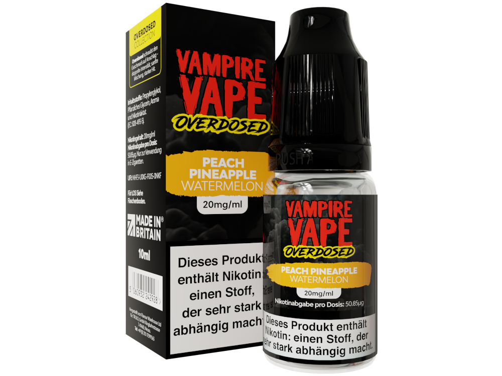 Vampire Vape Overdosed Peach Pineapple Watermelon ist ein E-Liquid in der 10-ml-Flasche mit dem Geschmack von Pfirsich, Ananas, Wassermelone, Eis und einem Nikotingehalt von 10mg, 20mg.