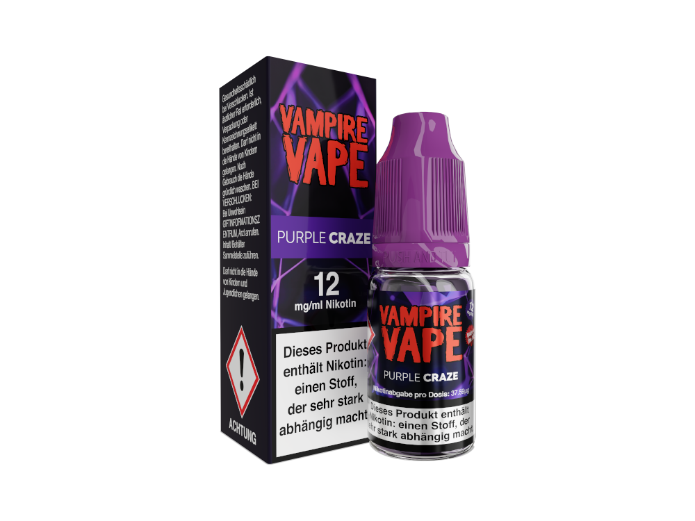 Vampire Vape Purple Craze ist ein E-Liquid in der 10-ml-Flasche mit dem Geschmack von Eukalyptus, Waldfrüchte, Anis, Beerenmix, Zitrone und einem Nikotingehalt von 0mg, 3mg, 6mg und 12mg.