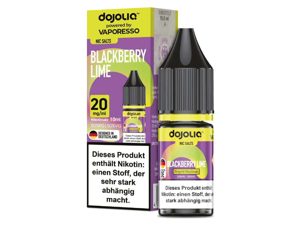 Vaporesso Dojoliq Blackberry Lime ist ein E-Liquid in der 10-ml-Flasche mit dem Geschmack von Brombeere, Limette und einem Nikotingehalt von 10 mg oder 20 mg.