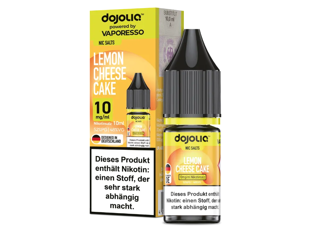 Vaporesso Dojoliq Lemon Cheese Cake ist ein E-Liquid in der 10-ml-Flasche mit dem Geschmack von Cheesecake, Zitrone und einem Nikotingehalt von 10 mg oder 20 mg.