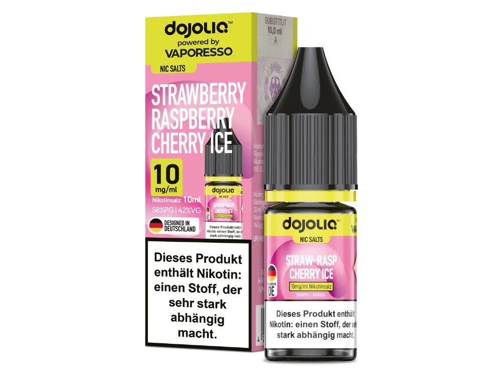 Vaporesso Dojoliq Strawberry Raspberry Cherry Ice ist ein E-Liquid in der 10-ml-Flasche mit dem Geschmack von Erdbeere, Himbeere, Kirsche, Eis und einem Nikotingehalt von 10 mg oder 20 mg.